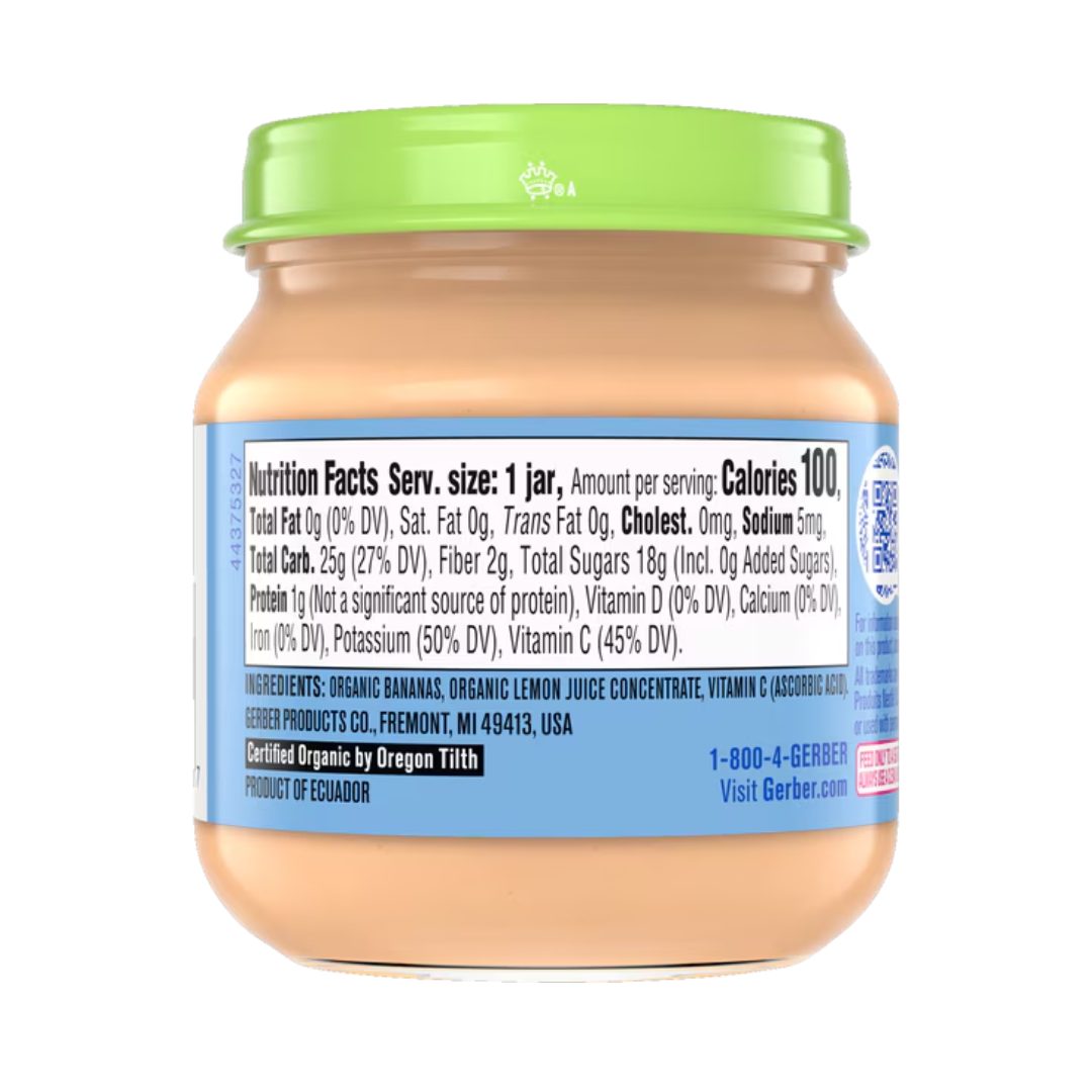 Gerber 1st Foods Banana Organic Baby Food uses organic fruits grown using Clean Field Farming practices for a nutritious, wholesome, safe option for every tiny tummy. Made with real fruit, this Gerber baby food offers the single-variety banana flavor that keeps your baby’s taste buds happy with 2 1/2 servings of fruit per jar. This Non-GMO Project Verified Gerber organic baby food contains no artificial flavors or colors, no added starch and is unsweetened for the best ingredients for your baby.